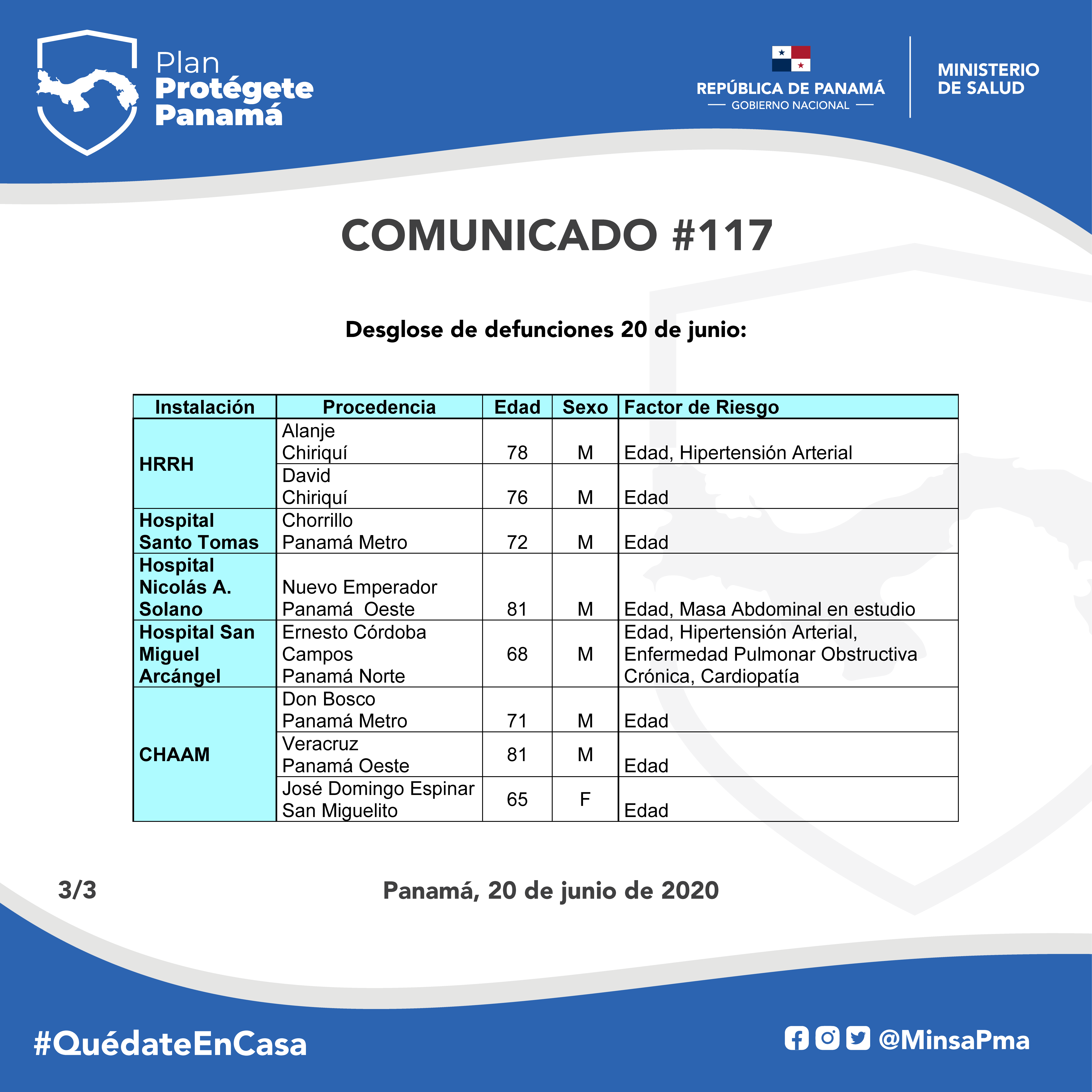 Toda información oficial referente a la pandemia en Panamá y las acciones del Gobierno Nacional se comunican a través de las cuentas oficiales del MINSA en las principales redes sociales y en su página web (www.minsa.gob.pa y yomeinformopma.org) también están disponible en el centro de atención de llamadas 169 y el número de WhatsApp 69972539.
