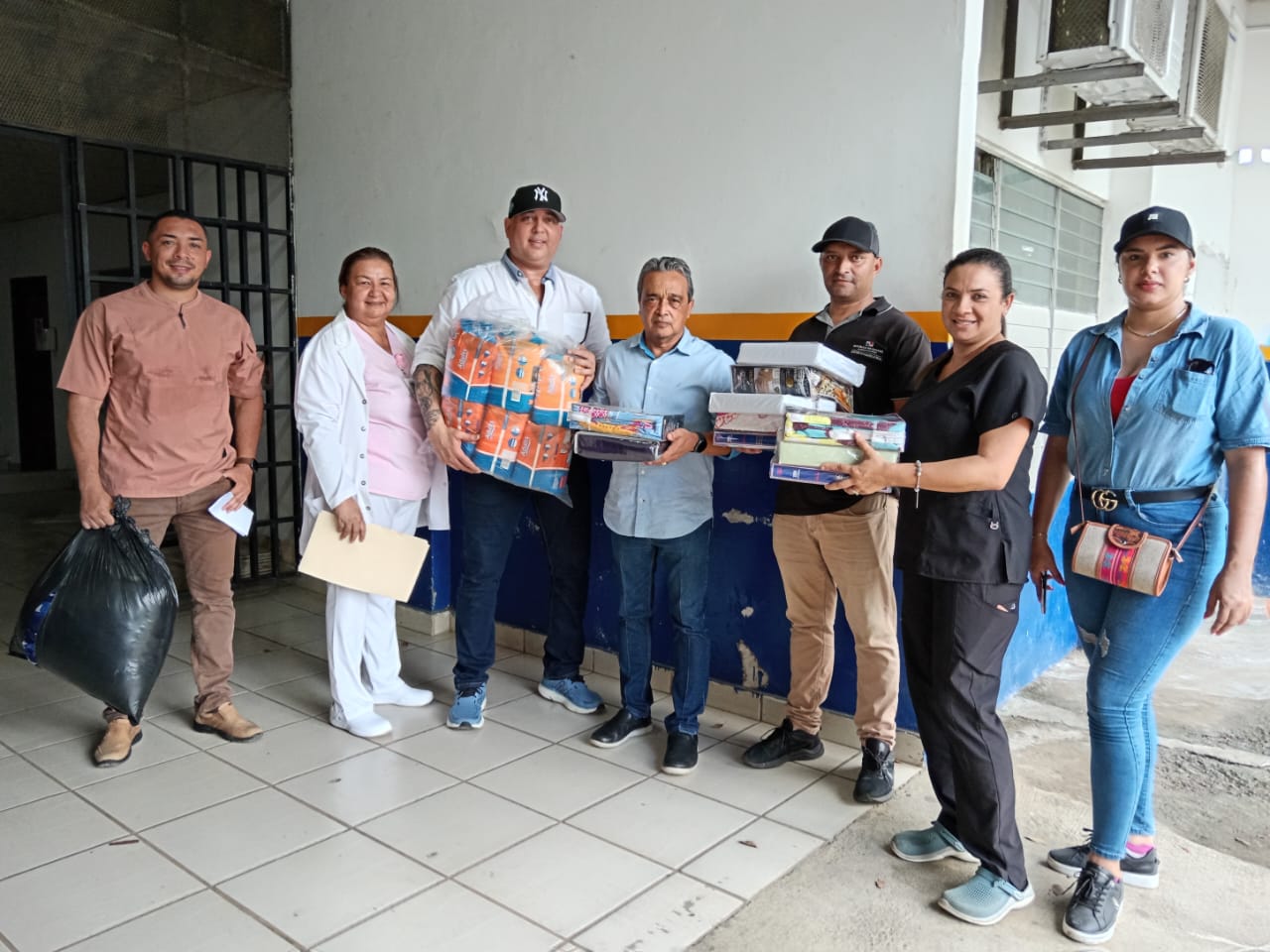 En compañía de la licenciada Urimia Jaén PhD, coordinadora regional del Programa de Cuidados Paliativos y el doctor Luis De Pasquale Barría, jefe de Provisión de Servicios, se entregó agua embotellada, leche, desinfectantes para pisos, clorox, pañales desechables para adultos, juegos de sabanas y frazadas.