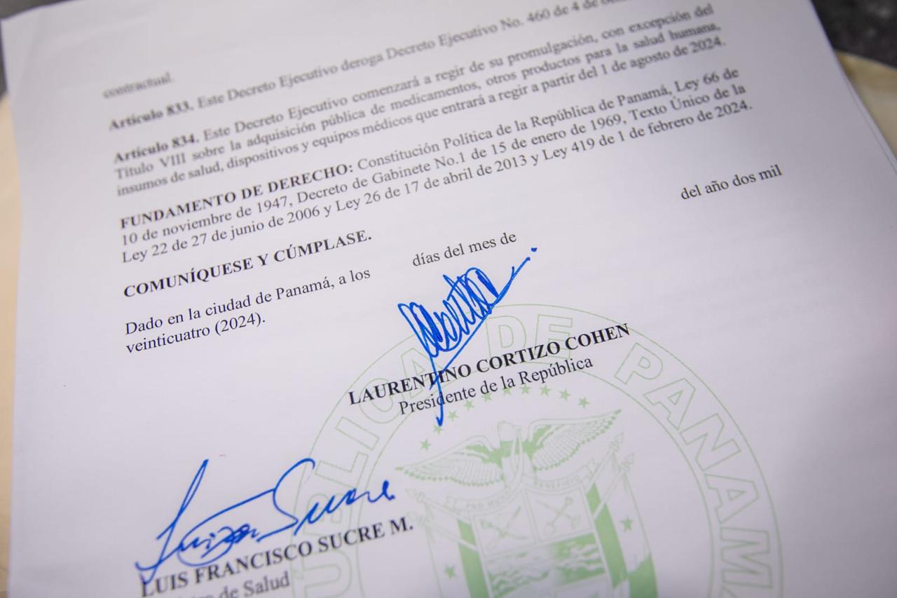 Panamá, 10 de mayo de 2024. El presidente de la República, Laurentino Cortizo Cohen, firmó el Decreto Ejecutivo 27 que reglamenta la nueva Ley de Medicamentos 419 del 1 de febrero de 2024, que regula los medicamentos y otros productos para la salud humana y la adquisición pública de medicamentos, otros productos para la salud humana, insumos de salud, dispositivos y equipos médicos. El Decreto Ejecutivo que reglamenta la Ley de Medicamentos consta de 836 artículos que determinan los procedimientos regulatorios con la finalidad de buscar soluciones a corto, mediano y largo plazo en el abastecimiento de medicamentos.